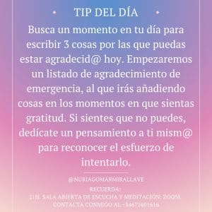 Busca un momento en tu día para escribir 3 cosas por las que puedas estar agradecid@ hoy. Empezaremos un listado de agradecimiento de emergencia, al que irás añadiendo cosas en los momentos en que sientas gratitud. Si sientes que no puedes, dedícate un pensamiento a ti mism@ para reconocer el esfuerzo de intentarlo.