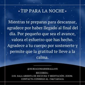 Mientras te preparas para descansar, agradece por haber llegado al final del día. Por pequeño que sea el avance, valora el esfuerzo que has hecho. Agradece a tu cuerpo por sostenerte y permite que la gratitud te lleve a la calma.