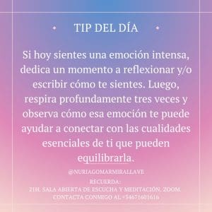 Si hoy sientes una emoción intensa, dedica un momento a reflexionar y/o escribir cómo te sientes. Luego, respira profundamente tres veces y observa cómo esa emoción te puede ayudar a conectar con las cualidades esenciales de ti que pueden equilibrarla.