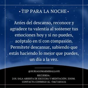 Antes del descanso, reconoce y agradece tu valentía al sostener tus emociones hoy y si no puedes, acéptalo en ti con compasión. Permítete descansar, sabiendo que estás haciendo lo mejor que puedes, un día a la vez.
