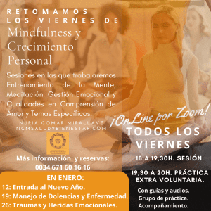 << Me motiva a continuar los temas que tratamos, la conexión con el grupo, y la implicación de Nuria. Me siento más receptiva y compasiva con mi entorno. Cada viernes práctico la escucha atenta y siento que las sesiones son un pilar importante para cuidar de mi M2. Y aunque llego cansada al viernes, al terminar la sesión me siento en paz y motivada. Me encanta que sigamos alternando sesiones de Mindfulness con desarrollo personal. ¡Por supuesto recomendaría estas sesiones! Es un entorno seguro donde intercambiar y acompañarnos cada quien en su proceso. Siempre aprendo algo cada viernes y siempre algo me resuena. Eso me parece maravilloso ya que luego puedo reflexionar el resto de la semana y trabajar en ello.>>